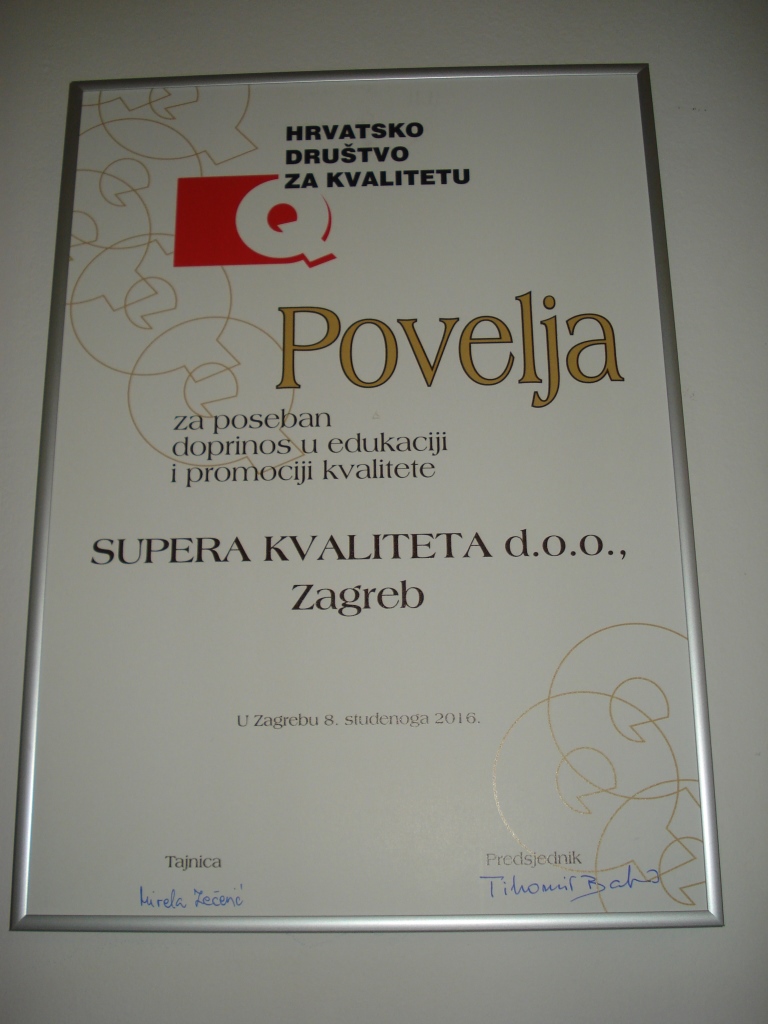 2016. SUPERA KVALITETA d.o.o. je, u kategoriji "malo poduzeće", dobila "Povelju za poseban doprinos u edukaciji i promociji kvalitete" koju dodjeljuje Hrvatsko društvo za kvalitetu (HDK)